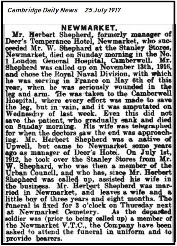 He was born in Emneth, Norfolk on 5th October 1885. Son of William George and Elizabeth SHEPHERD (née ROBB). of Emneth, Norfolk. 1891 census...Herbert [4] was a visitor at Upwell Low Road, Outwell staying with Joseph Smith, a farmer, and his wife Elizabeth. The rest of the family were at the Mill House, Emneth. His father William George SHEPHERD {38] was a Master Miller, born Outwell, mother Elizabeth [39] was born Outwell, brothers James [13], William [7] John Thomas [1] and sister Beatrice [10] were all born in Emneth. 1901 census...Herbert [16] was a grocers assistant, boarding with widow Lydia Cooper and her son at the Post Office, Outwell. His parents were now at Main Street, Upwell with James, William and John Thomas, plus Grace Lizzie [9] and Walter George [9] both born in Emneth. 1911 census...Herbert[25], still single, was Hotel Manager at the Temperance Hotel, Market Street, Newmarket. His parents were at The Mills, Upwell with James (now a widower), William, Grace and Walter and 11 month old Madge May SHEPHERD, presumably the daughter of James. He married Ursula Ruth GILLMAN in Newmarket in 25th July 1911 at All Saints Church, who later re-married as Ursula R EVANS, Stanley Stores, Stanley Road, Newmarket. There is no explanation as to why Herbert was seemingly never with the rest of his family. His father in law, Thomas Gillman was buried with him in 1929 |