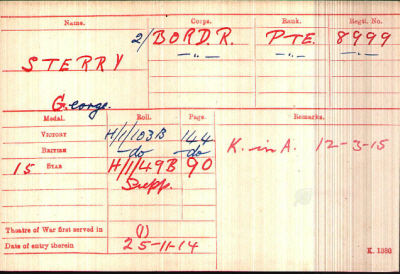 He enlisted in Kingston on Thames in 4th Battalion East Surrey Regiment #4298,at the age of 19 yrs 1 month in 1905, being 5'6" (167.6 cm)tall, weighing 126 lbs (57.3 kg) lbs and chest expansion of 2 inches. Army life suited him as after 6 months he was 5 feet 6.5 inches (168.9 cm) inches, 129 lbs (58.7 kg) with a chest 32" to 34.5" (81.3 to 87.6 cm). He gave his next of kin as mother, Mrs J BOND of 5 Grosvenor Yard, Newmarket Transferred to the Northumberland Fusiliers (# 1245) on 25th May 1905 he proceeded to Newcastle where he remained until 4th July 1905, then an unreadable attachment, before serving in Limerick from 15th Septemer 1905 until 12th October 1906. He took a bounty of 2 guineas to transfer to the Border Regiment on 16 August 1906 . After that he served at Tidworth Camp until 2nd November 1906 when he sailed on the HMT "Sicilia" to Gibraltar, arriving 8th November. He served in Gibraltar from 8th November 1806 until 3rd Octber 1908. On 4th October he sailed to India on RMT "Plassy", transferring on 23rd October to RIMS "Northbrook" which arrived ? on the 30th. Eventually we can read he was at Wellington (in Madras) from 4th November 1908 to 30th September 1910. On the 1st October 1910 he sailed in RIMS "Dufferin" arriving in Rangoon (Burma) on 7th October 1910 where he remained until 1st March 1912. He seems to have been awarded the Indian General Service Medal 1909, but which clasp is unknown, but given the years, it has to be North West Frontier.. He was then repatriated early from India as his period of Army service had expired. Transferred to the Reserves, ( after exemplary service) he gave his address as 5 Grosvenor Yard, Newmarket. He was now 5'7" tall, 36 1/2" chest. Recalled to the colours he was posted to the B.E.F, arriving in France on 25th November 1914. Shortly before his death he was found guilty of "drunkeness on active service and it seems to read his sentence of 14 days in prison was remitted. After his death on 12th March 1915 there was much correspondence trying to find his family to pass on his effects and medals. The Battle of Neuve Chappelle was the first attempt by the British to attack the Germans and initially seemed to be going well. However much of the barbed wire had not been cut, communication break downs led to confusion and eventually on the 12th the Germans halted the advance and Allied forces had captured a small salient 2,000 yards wide and 1,200 yards deep, along with 1,200 German prisoners, at the cost of 7,000 British and 4,200 Indian casualties. The 2nd Borders had 52 killed that day, and only 2 have identified graves. |