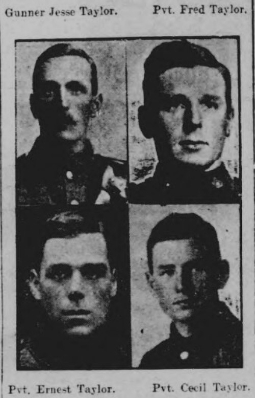 1901 census...Aged 7, he was at Birds End, Hargrave with his father Jesse [40] horsekeeper born Framlingham; his mother Emma [39] born Mendlesham; brothers James [18] horseman and Jesse [16] farm labourer, both born in Kenton; Samuel [13] and Frederick [10] both born Brandeston, Cecil [2] born Hartest; sister Elizabeth [14] born Cretingham. Ernest is recorded here as born in Kettleburgh. 1911 census... Aged 16, a farm labourer, he was at Green Farm, Hargrave with his parents (father horseman on farm); brothers Samuel [22] born Brandeston,a farm labourer; Cecil Herbert [12] born Hartest and Charles William [9] born Hargrave. Born in Hartest, enlisted in Newmarket ("Soldiers Died").-This soldier's father was Jesse (from "Soldier's Personal Effects"). As Ernest is named on the Astley Club plaque,he would appear to have been employed in horse racing at some time. It is not known when the family moved to Newmarket and Ernest's birth registration has not been positively identified. In fact only the first 3 of the nine children's birth registrations have been found anywhere. More positive identification came via the Bury Free Press of 14th July 1917 which published a photographic montage showing the four Taylor brother in uniform and reported:- FOUR NEWMARKET BROTHERS ON SERVICE Our photo is of four sons of Mr.and Mrs.Jess Taylor, of 2 Vicarage Road,Newmarket, and late of Hargrave, a much respected family who have shown their patriotism in a very practical manner. Gunner Jesse Taylor joined the Royal Field Artillery in January 1917. He did his training in Ireland and is now in France. He was employed before the war by Messrs T.Ridley and Sons, of Abbeygate Street, Bury St.Edmunds Prvt Fred Taylor joined the Winnipeg Grenadier Guards in March 1916. he landed in England in September of the same year and went to France in February 1917, where he is now serving in the trenches. Previous to joining up he had spent six years in Canada. Prvt Ernest Taylor, Suffolk Regiment, we regret to state, was reported missing on April 28th, and has since been officially reported killed in action. He had been wounded in July 1916, and returned to France in November. He was employed on the G.E.R. before enlisting. His age was 23 years. Prvt Cecil Taylor joined the King's Royal Rifles at the age of 18 and has since been transferred to the Machine Gun Corps. He finished his training and is now waiting to join his brothers in France. He was working in munitions in Woolwich 18 months before he joined up. This family record is an extremely praiseworthy one. In the light of this newspaper article it was then possible to re-visit Ernest's history, as it is now above. |