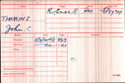 Born in Cheltenham in Q2-1892 [Cheltenham 6a:433], the 5th of 7 sons of William and Matilda TIMMINS (née JORDAN), later living in