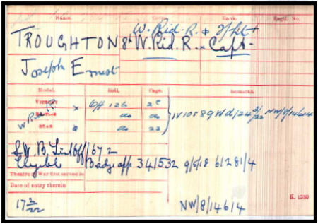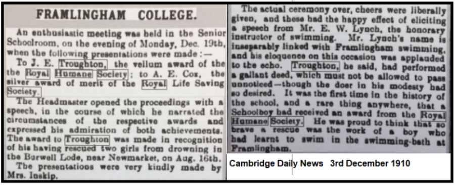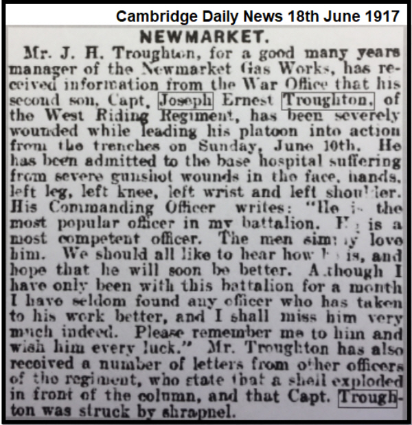 Born in Newmarket, on 7th June 1894 [Newmarket Q3-1894 4B:487] to Joseph Henry and Elizabeth Caroline TROUGHTON (née SANDERSON), of Victoria House, Exning Road, Newmarket. 1901 census...Joseph[ 6] was at Victoria House, Exning Road, Newmarket with his father Joseph Henry TROUGHTON, [37] engineer, Manager of Gas Works, born Bridlington; his mother Elzabeth C [37] born Dublin; brothers Frederick C [8] and William H [2]; sister Ida R [5]. All the children were born in Newmarket. 1911 census...Aged 16, he was a boarder at Framlingham.His parents were still at Victoria House, Exning Road, with his sister Ida Rosalie. At Framlingham he was a sub prefect, member of 1910 football XI and won the Waugh Cup for boxing in 1910. That year he was also awarded the Royal Humane Society vellum testimonial for saving a life from drowning. On 17t December 1918 in St Saviour, Paddington, he married Ada Helen WING of Maida Vale, London. |