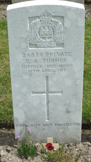 1891 census...Ernest [5] was at 6 Melton Cottages, Newmarket with his father John [28] stableman born Snailwell, his mother Elizabeth [27] born Bury St Edmmunds, and his brothers Henry [3], John [2] and James J [3 months] all born in Newmarket. 1901 census...Ernest [16] was a waiter at the White Hart Hotel, High Street,Newmarket. His parents and brother Henry and John had moved to Nat Flatman Street, Newmarket. 1911 census...Ernest [25] was still a waiter at the White Hart. His parents had moved to 10 Turf Terrace, All Saints Road, Newmarket with his brother James who was a ship's steward. He quite possibly married Gertrude M STURGEON in Newmarket in Q3-1916 who was Newmarket born and worked in a pub in Cambridge in 1911 but her address was later given by CWGC as Mrs TURNER of Springhead, Lees, nr Oldham. |