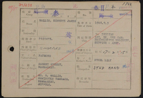 Born in Newmarket [Newmarket Q4-1917 3b:591], the son of Raymond and Ethel Lily WALLIS (née MOCKFORD) of Exning Road, Newmarket His name is mis-spelt on the Memorial. His date of birth, at Regent Street, Newmarket, on his PoW card is given as 3rd September 1918, and his parents were at Newington Terrace, Newmarket (which is on Exning Road). His occupation was stud hand. The 1939 register has his parents at 12 Woodditton Road, Newmarket, father Raymond [12-2-1883] a stud hand (Air Raid Precautions warden), mother Ethel L [11-9-1882]. |