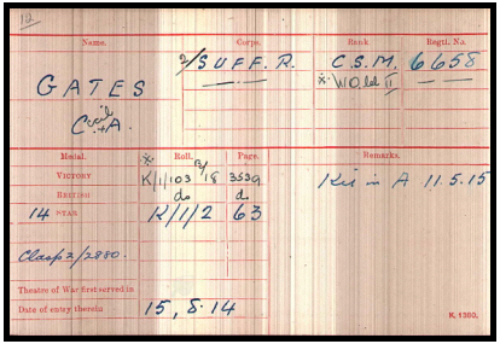 1891 census...Aged 3, he was at High Street Cottages, Stetchworth with his father George GATES [29] a butcher, born Waltham Abbey; his mother Elizabeth [31] born Halstead, brother Charles [5] born Nayland and grandfather Samuel WARREN [60] born Nayland 1901 census...Aged 13, he was at High Street, Stetchworth with his parents, and brothers Edward [9], George [8], Archibald [5], Reginald [3] and Victor [9 months] and sister Beatrice [[6]. All his siblings were born in Stetchworth. 1911 census...Aged 23, single, he was at Barrosa Barracks, Stanhope Lines, Aldershot with the 2nd Battalion, Suffolk Regiment. His parents and brothers George, Archibald, Reginald, Victor and Richard [8] were still in Stetchworth High Street. One of the 10 children had died, Constance, born and died in 1889. His younger brother George was killed in France in 1917. see here His eldest brother, Charles William was a regular in the Royal Navy, served through WW1 and was killed in an accident aboard HM Submarine Utmost in 1940 see here |