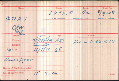All records show GRAY, not GREY as on the memorial Charles William GRAY born in Cambridge in Q3-1874 3b:472] baptised at St.Andrews the Less, Cambridge on 4th February 1875 to Arthur and Eliza GRAY (née BROWN), of 202 Newmarket Road, Cambridge. A registration of a marriage of Arthur GRAY or GREY to BROWN has not been found 1881 census...Charles [7] was at 97 East Road, Cambridge with his father Arthur [36], umbrella maker; sisters Phoebe [12] and Bertha [2] and brother Arthur [9]. All the children were born in Cambridge and all have a mother with the maiden name of BROWN. Have not found his mother. The following details are seemingly accurate but his earlier history is still a bit unsure. At this time a Tryphosa Symonds, born 1877, daughter of Thomas and Caroline Symonds, was in Kirtling (1881 and 1891 census) She had a sister Tryphena, but it looks as if the 'Try' part of their names was discarded as they grew older. 1891 census...Charles [16] was an errand boy living at 16 Abbey Street, Cambridge with his parents, father now a Hawker, and mother named as Eliza; brother Arthur and sister Bertha. He now has additional sisters all born in Cambridge, Eliza[8]; Emily [6]; Hannah [3] and Dorca [2]. The family name is transcribed as Groy. 1901 census... Charles appears to be the Charles W, married to Rosa (Phosa?)(b.13-5-1877) [23] born Vauxhall, London, and living at 31 Durham Street, Lambeth with their two children, Elizabeth [1] and Charles W [5 months] both born in Lambeth, the children all have mother's maiden name as SYMONDS. It turns out the marriage was in 1910 (Lambeth Q2-1910 1D:604) His widowed mother was at 100 Tyers Street, Lambeth with his sisters Berth; Eliza, Emily and Dora. On the 27th February 1904 a Phosa Simmons was transferred from Newmarket Workhouse to Lambeth workhouse, aged 25. but discharged that day. It has to be recognised that the Workhouse could also be a form of medical centre. 1911 census... Charles and Phosa GRAY are now at 6 Wynyard Terrace, Kennington with their children; Elizabeth; Charles William; Emily Eliza [9]; Robert Thomas [7] and Albert Edward [1]. His mother was visiting the Sharp family at 6 Park Cottages, Park Lane, Newmarket. All the children were Lambeth born. 2 children had died. (Hannah and Dorca). Charles was a carman,and his wife is now recorded as Kirtling born On his death, his mother was given in the Newmarket Journal as Mrs Arthur Gray of 17 Warrington Street, Newmarket Phosa Gray was on the electoral register in Lambeth, at 37 Glasshouse Street in 1920. The Newmarket Journal carried the following Memoriam Notice on October 30th, 1915. GRAY - In loving memory of my dear son, Charles William Gray, who was killed in action October 28.1914. One year has passed, our hearts still sore, As time goes on we miss him more. His loving smile and welcome face: Not one can fill the vacant place. Bright as the morn when reveille rang out, Honoured and loved by his comrades all; WhenLast Post was sounding his life was a doubt He answered his name at the last roll call. From his loving mother and sisters. The pension card has the birthdays of the children as : Elizabeth 23-7-1899; Charles William 1-11-1900; Emily Eliza 1-1-1902; Robert Thomas 9-8-1903 and George Henry 15-7-1912 (Albert Edward had died in 1914 aged 4) Phosa died in Lambeth in 1922. |