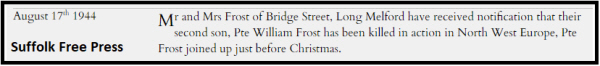William Charles Frost was born in 1923 (3rd qtr 1923 Bury St.Edmunds 4a:1617) son of Bertie John and Hetty Elizabeth FROST (née GRAINGER).