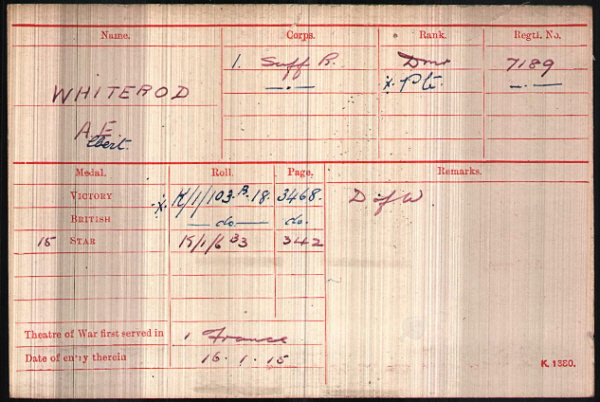 | seems to be this civilian Albert Whiterod was born in Alpheton (3rd qtr 1889 Sudbury 4a:657) son of William ? and Eliza? WHITEROD(née MASON).There is already a discrepancy, the GRO reoord has him born 3rd qtr 1899 and the 1891 census records him as 1 month old 1891 census...Aged 1 month, he was at Moseling ? Cottages, Long Melford with hsi father William WHITEROD[32] farm labourer born Stanstead; his mother Eliza[28] born Hartest; brothers Frederick [7] born Stanstead and Willie [5] born Melford; sister KIsabel [4] born Stanstead. 1901 census...Aged 11, he was at Streetly Hall Cottages, West Wickham with his parents (mother now recorded as Mary); Brother Fred, Willie and Percy [3] born Alpheton. Albert now recorded as born Alpheton 1911 census...Aged 24, he was in the Suffolk Regiment at Polymedia Camp, Cyprus. His widowed mother (Mary) was at Court Street, Nayland with his brothers Willie and Percy. Mrs E Court Street, Nayland was the claimant on his pension card |