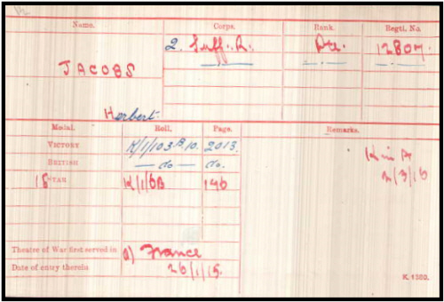 Herbert James Jacobs was born in 1893 in Little Livermere (Thingoe Q2-1893 4A:783), son of George and Mary Ann JACOBS (née HOLDEN).