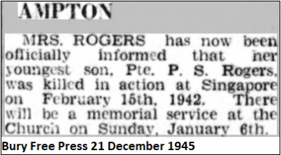 Percy Samuel Rogers was born in 1907 in Ampton(Thingoe Q1-1908 4A:965), son of John and Jane Susannah E. ROGERS (née WELLS).