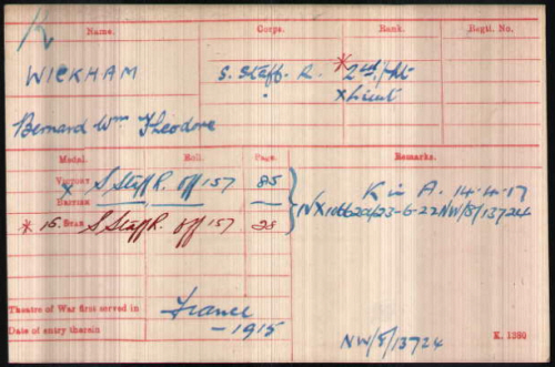 From the London Gazette, August 25, 1916. 2nd Lt B.W.T.Wickham: For conspicuous gallantry in the face of the enemy On the morning of the 28th July 1916 in the vicinity of Contalmaison 2nd Lieutenant Wickham with a platoon which had been at work all night wiring in No Man's Land, was in a forward trench, when the enemy made a bombing attack. The garrison and the greater part of the working party were obliged to fall back for want of bombs. 2nd Lieut Wickham with two men of the Durham Light Infantry, stood his ground, searched the trench for bombs, and held it for more than an hour until reinforcements arrived. Though wounded early in the action he continued in charge of a joint party of South Staffords and Durham L.I until the attack was beaten off, and a Sergeant could be found to march his platoon out on relief. On 14th April 1917, the 9th South Staffs, a pioneer battalion, were working from Ypres Infantry Barracks. The war diary has a different date for the death of Bernard Wickham, ie 13th, which begs the question, did his own battalion officers at the time get it wrong, or the Army records:- 13th- A Coy..144 OR working on tramway at SHRAPNEL CORNER C Coy..87 OR wiring CRESCENT, 50 yards completed .......91 OR SWIFT STREET cleaning out trench 80 yard done D Coy..70 OR ZILLEBEKE ST sandbagging parapet .......74 OR VOLLEY COTTAGES repairing road B Coy on attachment Lt BWT WICKHAM killed in action 3 OR wounded (2 remained on duty)