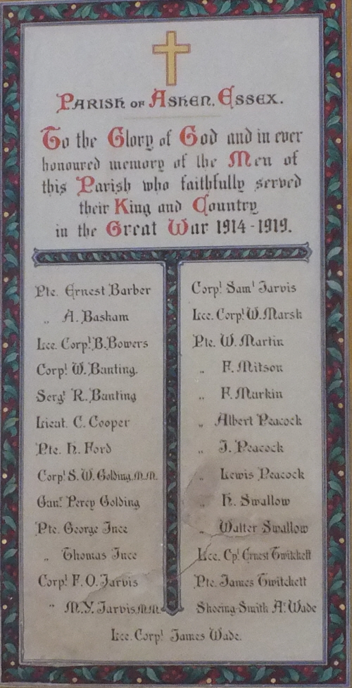 Inside the church in a glazed frame, the roll of honour of those who served in 1914-1919