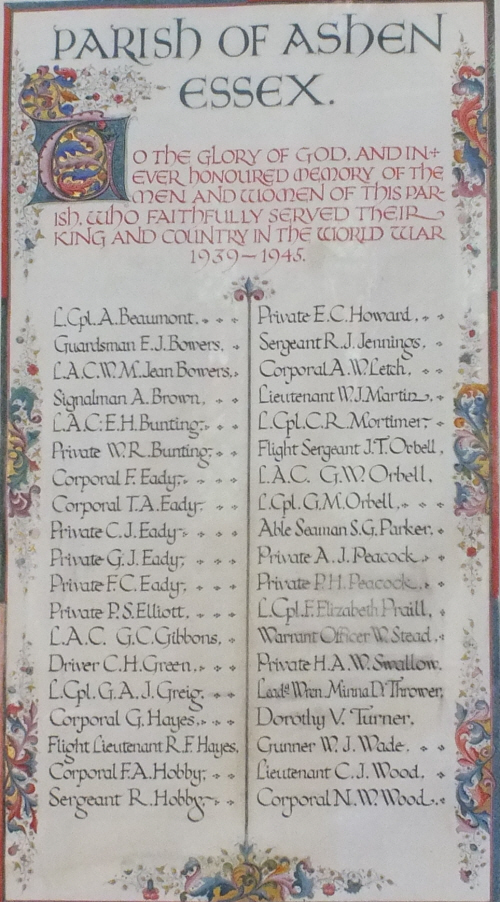Inside the church in a glazed frame, the roll of honour of those who served in 1939-1945