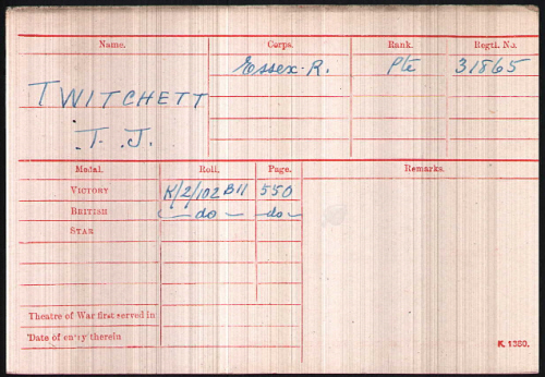 1901 census...Aged 7, Thomas was at Pannels Ash, Ashen with his father Joseph TWITCHETT [43] horseman; his mother Rebecca [45]; sisters Annie [3] and Ena [3]. All were born in Ashen. 1911 census...Aged 17, now James, a farm labourer, he was still in Pannels Ash with his parents and sisters Annie and Ena His nephew Percy Peacock (son of sister Ena) died as a prisoner of war of the Japanese in 1943.. see here |
