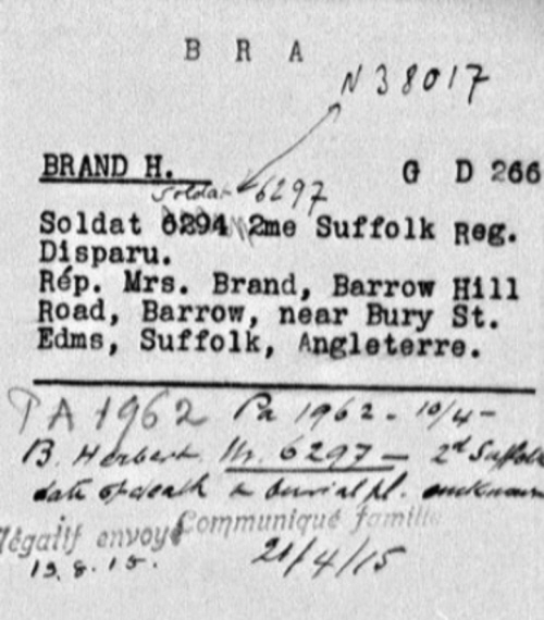 Hewrbert Brand was born in Barrow in 1884 (1st qtr 1884 Thingoe 4a:652) son of James and Mary BRAND (née CLARRY)