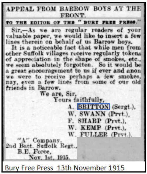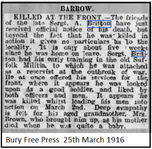 Unable to find his parents. They seem to be the Albina BROWN, marrying Alfred Thomas BRITTON in Southwark in 1890. His mother died when he was very young (see Bury Free Press below) 1901 census...Aged 10, he was at Barrow Street with his widowed granmother Mary Ann BROWN [67] born Higham; cousin Frederick BROWN [25] born Barrow and Ada BROWN [13] born Burton on Trent 1911 census...Aged 20 a farm labourer he was Barrow Street with his grandmother, and his cousins Frank [20] and Arthur BROWN [7]. |