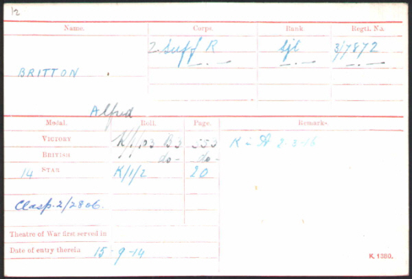 Alfred Thomas Britton was born Barrow (3rd qtr 1891 Thingoe 4a;729 ) son of Alfred and Albina BRITTON (née BROWN)