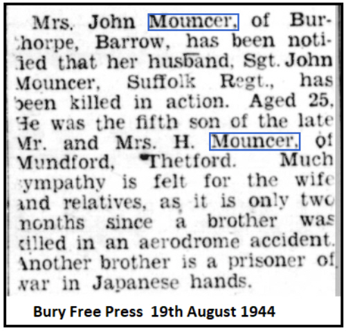 John Henry Mouncer was born in Mundford, near Thetford 5th January 1919 (1st qtr 1919 Thetford 4b:419) son of Herbert and Emma Ethel MOUNCER (née CHATTEN)
