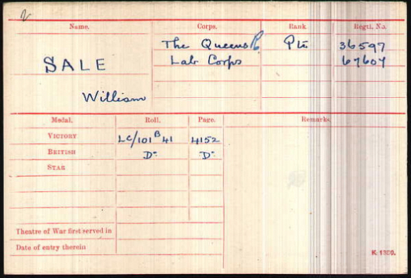 As he was with the Labour Corps at the time of his death it is virtually impossible to ascertain where he was at that time. The CWGC have been informed that their record show William as in the Queens Own (Royal West Kent Regiment, but his CWGC headstone shows him in the Queens, whch is the Royal West Surrey Regiment.