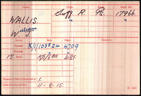 William James Wallis was born in Barrow (1st qtr 1881 Thingoe 4a:593) son of George and Matilda WALLIS (née WRIGHT). The surname appears at times as WALLACE.