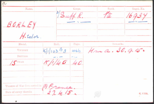 Hector Charles Borley was born in Beyton (3th qtr 1884 Stow 4a:703) son Charles and Eliza Florence BORLEY (née GAME)