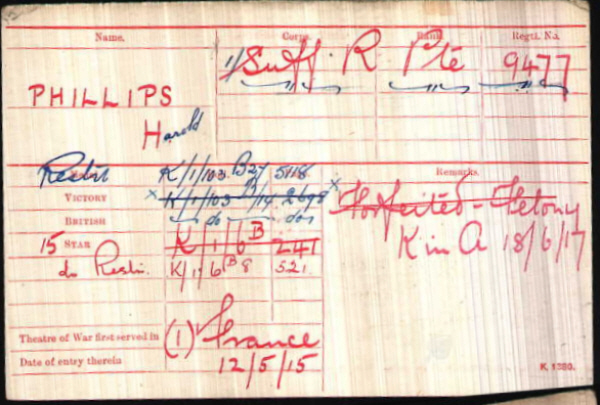 Harold Ernest Phillips was born in Gt Barton (3rd qtr 1894 Thingoe 4a:736) son of Elizabeth PHILLIPS. His mother married James Frederick Cocksedge in 1898 .