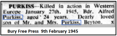 Alfred Raymond Purkiss was born in 1921 (1st qtr 1921 Bury St.Edmunds 4a:1724) son of Ernest and Lily M PURKISS (née HUNT)