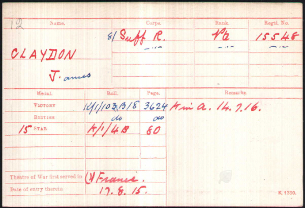 James Clayden was born in Hempstead (3rd qtr 1883 Saffron Walden 4a 534) son of Alfred and Eliza CLAYDEN (née WILLIS). Although registered as CLAYDEN,he can be found as CLAYDON