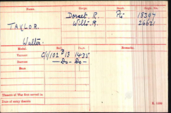 1891 census...Aged 2, he was at Pledgers Farm, Stansfield with his father Frederick TAYLOR [31] farm labourer born Stansfield; his mother Eva [31] born Poslingford; brothers George Henry [7] born Stansfield and Arthur [6] born Cavendish; sister Sarah [4] born Cavendish and Jane Maria [1 month] born Stansfield 1901 census...Aged 12, shepherd, he was at Lay's Farm, Glemsford with his parents; brothers George (farm labourer) and Arthur (labourer); sisters Jane and Eliza [7] born Stansfield. 1911 census...Walter has not been found in this census. At Goymer's Farm, Denston were his parents and brothers George and Arthur. The pension card has his father at Park Farm Cottages, Boxted. The family was always on the move, but we do not know when they moved to Boxted. His brother Arthur was killed in France in 1918 ..see here |