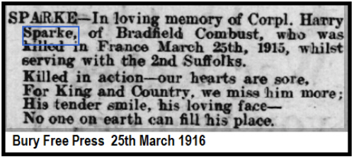 1901 census...Aged 7, he was at Brands lane, Lawshall with his father Alfred SPARKE [39] horsekeeper on farm; his mother Ellen[30]; sisters Elsie [11] and Alice [5]; brother John [10]. All ere born in Shimpling. 1911 census...Aged 17 a farm labourer, he was at New Barn, Cockfield with his parents; brothers John (farm labourer), William [9] born Lawshall, Fred [6] born Lawshall;sisters Alice, Beatrice [7] born Lawshall and Vera [1] born Alpheton; nephew Charlie [9 months} born Cockfield (parentage not known but appears to be son of Elsie) The actual Bradfield Combust connection has not been found, except the memoriam notice in the Bury Free Press His sister Alice married William SAVOY and was the mother of the brothers (Gerald and Derrick SAVOY) killed in WW2 see here |
