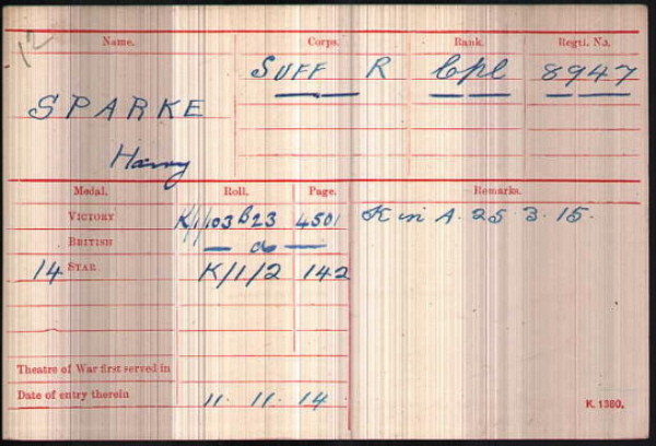 Harry Sparke was born in Shimpling (2nd qtrm 1893 Sudbury 4a:753) son of Alfred and SPARKE (née UNGLES)