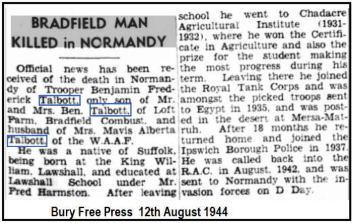 He married Mavis Alberta WILTON of Handsworth, Birmingham in the 1st qtr 1944, in Birmingham. She was serving in the W.A.A.F at the time of his death. His home residence was recorded as Loft Farm, Bradfield Combust In the 1939 register he was single, a police constable lodging at 3 Kitchener Road, Ipswich. His parents and sister Edna were at the King William Inn, Lawshall, where is father was publican/farmer |