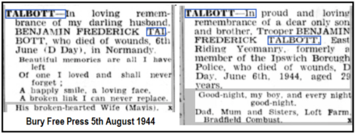 Benjamin Frederick Talbott was born on 18th May 1915 (2nd qtr 1915 Sudbury 4a:1711) son of Benjamin and Melinda Jane TALBOTT (née ARMSTRONG)