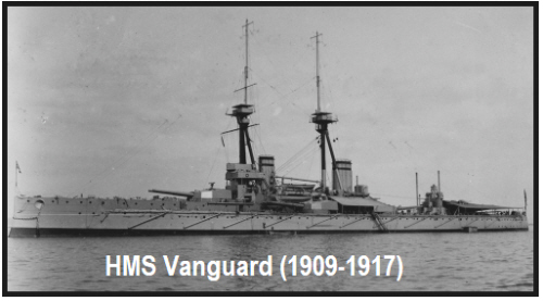 As Stoker 2 he served 23-9-1905 to 19-2-1906 at HMS Pembroke II 20-2-1906 to 30-4-1907 at HMS Sapphire II, being [promoted Stoker I 1-5-1907 to 18-5-1908 on HMS Blenheim 19-5-1908 to 23-6-1908n at HMS Pembroke II 24-6-1908 to 8-8-1910 on HMS Indomitable 8-8-1910 to 30-1-1911 at HMS Pembroke II and promoted Leading Stoker 31-1-1911 to 31-3-1911 on HMS Crescent 1-4-1911 to 31-3-1913 on HMS Tamar and promoted Stoker Petty Officer 1-4-1913 to 31-5-1913 on HMS Royal,Arthur 1-6-1913 to 26-1-1914 at HMS Pembroke II 27-1-1914 to 17-3-1914 on HMS Patrol 18-3-1914 to 30-3-1914 at HMS Pembroke 31-3-1914 to 9-7-1917 on HMS Vanguard His service record does not record the "Handy" in Hong Kong in the census of 1911 HMS Vanguard was launched in 1909, a St Vincent class dreadnought battleship. She saw action in the Battle of Jutland but was mainly used on routine patrols and training in the North Sea. Just before midnight on 9th July 1917, at Scapa Flow, there was a series of magazine explosions and she sank almost immediately, taking 843 of the 845 men aboard. Only 22 bodies were recovered.