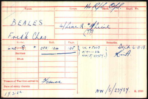 Frederick Charles Beales was born in 1894 in Bardwell (Thingoe Q3-1894 4A:735), son of Charles and Isabella BEALES (née KELLY).