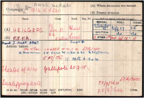 Frank Julius Frederick Alexander Heilgers was born in Kensington on 26th June 1892 (Kensington Q3-1892 1A:107) son of Alexander Frederick and Sophie Louise HEILGERS