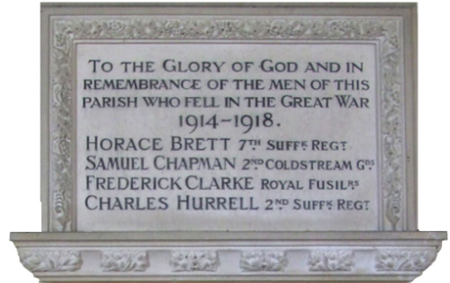 Inside All Saints church, Barnardiston is a wall mounted roll of honour. A grey stone plaque with an ornamented border. The dedication reads:-