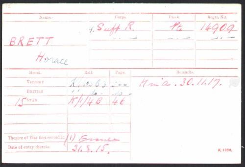 Horace Brett was born in Barnardiston on April 3rd 1896 (Risbridge Q2-1896 4A:735), baptised in All Saints, Barnardiston on 21st June 1896, son of George