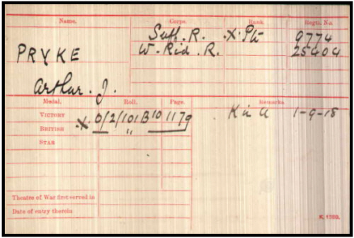 chest 31" to 34" (78.7 to 86.4 cm), weighed 109 lbs (49.6 kg), blue eyes, brown hair. His entry under religion is not C of E but it is unreadable. He joined the regiment in the 3rd General Service Battalion at Felixstowe. Promoted acting unpaid Corporal on 19th May 1917, this was relinquished on 12th September 1917 when he left Folkestone for Boulogne and was transferred first to the 15th Battalion and then to the 9th Duke of Wellington's (West Riding Regiment), joining them in the field on the 21st September 1917. he was killed in action on 1st September 1918. His exhumation card actually states he had died of his wounds, but all other documents say killed in action. Although there is a map reference for his original burial, unfortunately it is only a 1,000 yard square. His sole legatee was sister Florence who in 1919 was at Church Lane, Barnham. On 28th February an M.Pryke wrote to the Army to request they sent no more forms to Florence, they were not required. Florence had by then received his personal effects of wallet, photos, religious book, certificate, cards and attestation papers. CWGC have 28 of the Battalion killed on 1st September