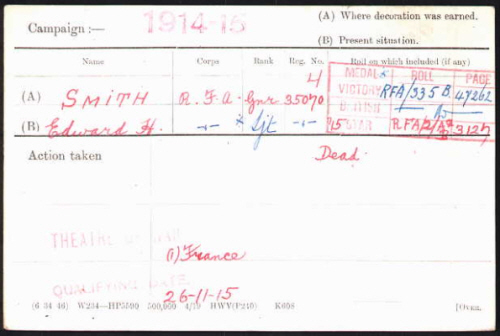 De Ruvigny's Roll of Honour has :- "SMITH, EDWARD HOLLOCK, M.M. - Sergt.,No.305070, C Battery, 153rd Brigade, Ulster Division, Royal Field Artillery, eldest s.of Edward Albert Smith of Mills, Mildenhall, co. Suffolk, Farmer, by his wife, May Annie; b. Great Easton,co.Essex, 24 Feb.1883 {incorrect}; educ. Barton Mills Board School; enlisted 24 June 1915; served with the Expeditionary Force in France and Flanders, and was killed in action at Messines Ridge 13 July, 1917. Buried near Messines Ridge. His Commanding Officer wrote:" I am exceedingly sorry to have to write and tell you your husband was killed in action this morning. Knowing what a tremendous loss he is to this battery, I know what a great blow it must be to you. He was looked up to in the battery by all the men, and was most highly thought of by all ranks, officers and men. Words of sympathy seem such a poor thing to offer you in your great grief, but the officers and men have asked me to tell you how deeply they do sympathize with you and mourn the loss not only of a really good soldier, but also of a real comrade and gentleman". and another officer: "I am taking it upon myself to write these few words of sympathy regarding the death of your husband Sergt E.H.Smith. During the week before his death he was a great example of courage and great coolness to the men, and when the end came he was doing his duty as a British soldier should. As I was close by him at the time, I can vouch for the fact that death was instantaneous and that he suffered no pain whatsoever. I will say no more, as words fail me on this subject". He was awarded the Military Medal for bravery in the field. He m. at Mildenhall, co.Suffolk, 25 Sept.1915, Ada Elizabeth, dau. of the late Joesph Woollard of Nodds Hall, Tuddenham St.Mary, Mildenhall co.Suffolk. Thanks to "Our Village and the Great War" we have more. From the Bury Free Press of 1st September 1917:- The news that Sgt. Edward Hollock Smith had been killed in action caused deep and widespread regret throughout Barton Mills and the adjoining parishes. The deceased was the husband of Mrs Ada E.Smith of Nods Hall, Tuddenham. The distressing event happened on 13th July in France. He volunteered his services in July 1915, enlisting in the Royal Field Artillery. In civil life he was associated with the provision trade. He was 34 years of age." and letter received on his death Dear Mrs Smith, I am exceedingly sorry to have to write and tell you your husband was killed in action this morning. Knowing what a tremendous loss he is to this Battery, I know what a great blow it must be to you. He was looked up to in this Battery by all the men, and was most highly thought of by all ranks, officers and men. Words of sympathy seem such a poor thing to offer you in your great grief, but the officers and men have asked me to tell you how deeply they sympathise with you, and mourn the loss of not only a really good soldier, but also of a real comrade and gentleman"......T.Hughson, Captain, "C" Battery 153 Brigade. Dear Mrs Smith, I am taking it upon myself to write these few words of sympathy regarding the death of your husband, Sgt E.H. Smith of this Battery. During the week before his death he was and example of courage and coolness to the men and when the end came he was doing his duty as a British soldier should. As I was close by him at the time, I can vouch for the fact that he suffered no pain whatever. I will now say no more as words fail me on this subject. I remain yours sincerely Hugh Tower, 2nd Lieutenant, "C" Battery 153 Brigade". Another report from the Bury Free Press:- A ceremony of an unusual and pathetic character took place at the Northern Army Bombing school trenches on Thursday week, the occasion being the presentation to Mrs Ada Elizabeth Smith of Nod's Hall, Tuddenham of the Military Medal won by her late husband, Sergt. Edward H. Smith of "C" Battery, 153rrd Brigade, R.F.A. who was killed in action in France on the 13th July last. The soldiers attending the Bombing School paraded at the trenches. Major J.B.White, the Commandant of the school who made the presentation stood underneath the flag on a raised platform of sandbags. Mrs Smith, the widow, was conveyed to the scene by motor car and the deceased soldier's mother and two of his sisters were also in attendance. Major White remarked that Sergt Smith came forward in the early period of the war, joining up in July 1915. he went forward step by step and gained the admiration of his comrades as well as his officers. He became sergeant, and had been recommended for promotion which he would have gained, if it were not for his untimely death. He never faltered, but went forward and died for his Country and the cause the Allies were fighting for. They were there that day to present to the widow the medal Sergt.Smith had earned by his bravery and gallant conduct on the field. Major White then handed Mrs Smith the medal, and as he did so, the soldiers presEnted arms with fixed bayonets and sounded the General Salute".