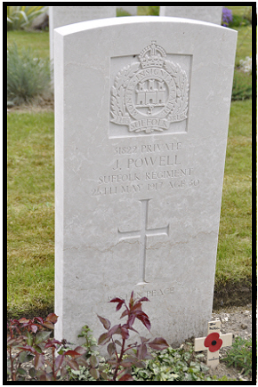 He enlisted in Newmarket . Neither Lt Col Murphy's History of the Suffolk Regiment, nor the battalion war diary are very informative. It appeared to be quiet, only 2 reported killed, 2 wounded. Relieved the next day by the 9th Norfolks, whose war diary does say they were at St Elie near the Quarries at Hulluch. The Bury Free Press of 23rd June 1917 reported:- HOLYWELL ROW MAN FALLS IN ACTION - Mrs. Powell, the wife of Prvt.John Powell, Suffolk Regiment, has been officially notified he was killed in France on May 28th. He fell on his 30th birthday, and he leaves a widow and three young children. Much sympathy is felt for them. There are three brother soldiers of the deceased. Prvt.William Powell, Suffolk Regiment was wounded on the right hand, and a second brother, Prvt. George Powell, has been wounded in both legs. He is in the King's Light Infantry. A third brother, Prvt.Albert Powell, has been home on leave.
