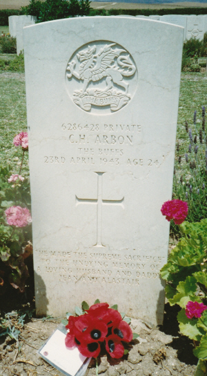 The local press in May 1943:- KILLED IN ACTION - Mr and Mrs Arbon, Wangford, have been notified that their youngest son, Private Charles Arbon, Buffs, has been killed in action in North Africa. He was previously involved in the evacuation from Dunkirk and had worked on Lord Iveagh's estate at Wangford before the start of the war. He is attributed to the 2nd Battalion, The Buffs, but was probably with the 5th as the 2nd had moved on to the Far East. The 5th were in Tunisia and later in Sicily It was the time of the battle for Long Stop Hill in Tunisia, the Buffs trying to take Djebel Rhar. They had four killed on this day. Initially Charlie was buried in 2:G:31 at Baharine but this cemetery was concentrated into Medjez el Bab War Cemetery in August 1944. |