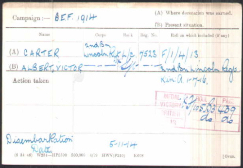 Albert Victor Carter was born in Brandon (Thetford Q3-1887 4B:372) son of William and Emily CARTER (née SYMONDS). 1891 census...Aged 4, he was at Albion House, Brandon Wood, Brandon with his father William CARTER [39] gun flint maker; his mother Emily [34]; sisters Emily E [14], Mildred [9], Florence [8], Beatrice [7] and Ethel [5]; brothers William [12], John [11], Leonard [2] and Edward [1]. All were born in Brandon. 1901 census...Aged 14, a gun flint maker, he was at London Road, Brandon with his parents; brothers William (gun flint maker), Leonard, Edward and Harry [8] born Brandon; sisters Florence, Ethel and Allace [9] born Brandon. 1911 census...Aged 26, a private in the 1st Battalion, Lincolnshire Regiment, he was in Aden. Brother Leonard was in the 7th Dragoon Guards in India. His widowed mother was housekeeper to Henry Warf at Broomhill Farm, Weeting and his brother Walter Herbert [9], born Brandon, was living there also. His father had died in 1904. Brother Harry enlisted in September 1914 in the Leicester Regiment, transferred to the South Staffordshire Regiment but was discharged after just 86 days. By this time his mother was living at Bradfield, near Walsham. Her address in 1919 was Broomhill, Brandon His brother Leonard was killed in Belgium in 1914. see here |