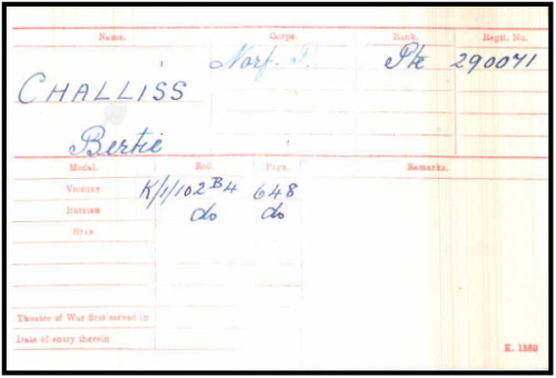 Bertie Challiss was born in Brandon (Thetford Q3-1888 4B:367) son of William and Lucy CHALLISS (née THOMPSON).