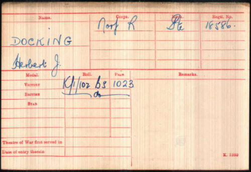 Herbert Docking was born in Brandon in 1893 (Thetford Q3-1893 4B:373) son of Herbert James and Ellen DOCKING (née FOX).