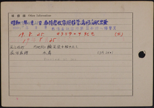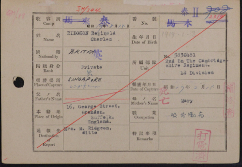 Reginald was captured on 15th February 1942, the day Singapore was surrendered to the Japanese. The 2nd Battalion fought to the last at Braddell Road. A report in the local press in 1944:- P.O.W. - Mrs M Ridgeon, 16 George Street, has recently received the first news of her son, Private R Ridgeon. He has written to say that he is in a Prisoner Of War camp in Thailand and is in excellent health and working for pay. Sadly by this time Reginald was already dead. The "excellent health and working for pay" would seem to be Japanese propaganda in any event. His PoW card is annotated "buried at sea". This date does not fit with so far discovered sinkings of any of the Hell Ships. It appears to be a case of dying on a voyage to Japan, but the ship has not not yet been identified. |