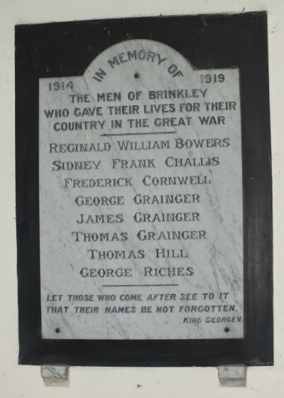 Brinkley has no monument as a war memorial, they have a wall mounted, white marble plaque in Brinkley (St. Mary's) Church. The Village Hall was built in 1920