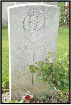 1891 census...Aged 3 months, he was at Denver Sluice with his father Alfred DUNNETT [32] boatwright, born Hilgay; his mother Rosanna [24] born Crimplesham, brother Alfred Banham [1] born Denver and aunt Mary WADE [15] born Crimplesham. 1901 census...Aged 10, he was at North Street, Burwell with his parents; brothers Alfred Banham, Arthur H. [8] Robert W. [6] both born in Denver, Bertram [2] and Edward [2months] both born in Burwell, and sister Harriet Rose [7] born Denver. 1911 census...Aged 20, a boat builder, he was at North Street, Burwell with his widower father and brothers Alfred Banham (boat builder), Robert William (gardener) Bertie, Edward and sisters Harriet Ann and Alice [7] born Burwell. His mother had died in 1907. On 26th December 1912, in Burwell, he married Ada FULLER. Their son Kenneth John was born in Burwell on 31st October 1914. later living at Retail Yard, North Yard, Burwell. He was a younger brother of Alfred Banham DUNNETT who was killed in Belgium in 1917 see here |