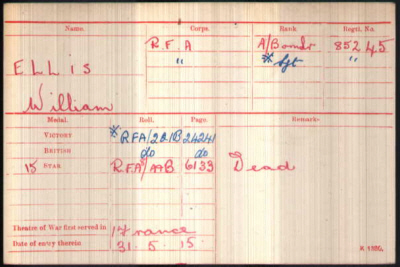 1901 census...Aged 5, he was at High Street, Burwell with his father Howarth ELLIS [33] hairdresser, born Rochdale, Lancashire; his mother Kezia [29] born Burwell; brothers Joseph [6] born Newmarket, and Albert William [1] born Ware, Herts, and sister Isabella [3] born in Newmarket. 1911 census...Aged 15, a apprentice hairdresser, he was at High Street, Burwell with his parents; brother Joseph Howarth (cow boy), brother Albert William and sisters Isabella Mary, Winifred Louise [6] and Constance [3] both born in Burwell; brothers James Simpson [9] and Thomas Frederick [11 months], both born in Burwell. He was the younger brother of Joseph Howarth ELLIS who died on HMS Bulwark in 1914 see here and elder brother of Albert William ELLIS who died in Egypt in 1921 see here |
