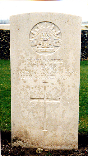 He first enlisted in Australia on 28th March 1915 at Holsworthy in the 12th Light Horse, No.37, a single man, farmer, born near Newmarket, England, next of kin his mother Mrs A Parr of Burwell. He gave his age as 25 years 11 months, was 5ft 7" (170.2 cm)tall, weighed 140 lbs (63.7 kg), chest 34.5" to 37" (87.6 to 94 cm), blue eyed, brown hair and Church of England. Sworn in at Liverpool, New South Wales. He should have embarked on HMAT "Suevic" on 13th June 1915 but was not found. The Provost Marshall was unable to find him, and a warrant was issued for his arrest for desertion in July 1915. He still had not been found in November. Then, as William BARRY he enlisted on 6th January 1916 and was sworn in at Sydney as No. 10531 in the 3rd Division Signals Company. This time he was a mental attendant with a wife at Sorrell Street, Parramatta North, discharged by purchase from the 9th Lancers. Giving his age as 26 years and 8 months, his measurements were unchanged. He was in Infantry Reinforcements from then until 12th February 1916 , going on to Signal School until joining 3rd Division Signals Company as Sapper on 15th March 1916. He was posted to 34th battalion AIF on 30th October 1916, in England Whilst awaiting embarkation in May 1916, on 13th May he signed a form stating he was in reality Urban PARR, date of birth 5th April 1889. Despite this he continued to be recorded as William Barry, even being buried as such initially. It appears that it was as late as 1924 that some departments were being asked to delete "BARRY" and replace with "PARR" Embarked on HMAT "Ascarius" at Sydney on 27th May 1916, he left for England. On the voyage he was sentenced to 168 hours detention for conduct to the prejudice of good order and military discipline. He proceeded via Southampton to France on 21st November 1916. Sometime in 1916, a Miss Beatrice A Palmer of Ingleholme, Brockley View, Forest Hill, London was trying to find him (as Urban Parr). In France he was detached to the Intelligence Department at Rouen from 30th March to 5th May 1917, then to Brigade Signals School on 19th August before rejoining 34th Battalion on 25th August. He was somewhere in the Passchedaele region (report 51.284 (C))is recorded on his burial records) when he was reported missing and presumed dead on 12th October 1917. His body was eventually found and identified by his disc which apparently was as BARRY. In 1918 his wife Alice Florence (née TURNER) was still trying to find him. Letters from the Army were addressed to Mrs BARRY at Sorrell Street, Parramatta, she replied as Mrs A.Parr and eventually she was awarded a £1 a week pension for herself and £1 a week for one child. Other records show one child as Robert Patrick TURNER [1913-1919] and another as Urban James John PARR [1916-1916]. As late as July 1938 the Australian Army were still trying to sort out his medals. They had sent his War Medal medal out to his wife and it turned up in 1938. Their enquiries revealed they found no relative interested since Alice had re married to Hjalmad Gunner BOECK on June 22nd 1922 and had died on 17th June 1926. Her second husband then re married. In all this, 85 pages from Australian archives, there is no mention of disciplinary action as a result of his desertion. Probably they took the practical step of realising they actually had him in the Army, and was more use there than in prison, and later his death made any punishment impossible. Interestingly the Australian Army seemed no more efficient than ours, since often the left hand never seemed to know what the right hand was doing. After this it will come as no surprise that the actual location of his death is not accurately found, but since it was the opening day of the first battle of Passchendaele, that is not so surprising after all. The Australians had 850 killed that day, 556 with no known gave and named on the Menin Gate in Ypres. Urban's unit had 84 killed, 22 eventually being identified. ![]() ![]() 1st headstone......and replacement photo: Rodney Gibson click here to go to the Commonwealth War Graves Commission website for full cemetery/memorial details |