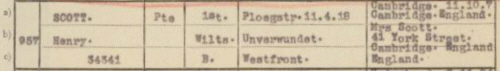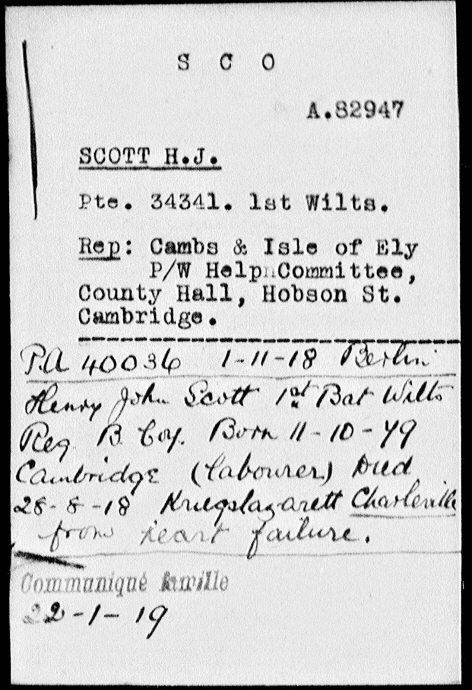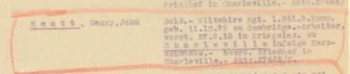 He was taken prisoner (unwounded) on 11th April 1918 at Ploegsteert on the day that the Germans captured Ploegsteert Wood . His date of birth given as 22nd January 1879, next of kin Mrs Scott, 41 York Street, Cambridge. He died of heart failure at the Kriegslazarett (War Hospital) in Charlesville. This explains why he was originally buried in Charleville-Mezieres.